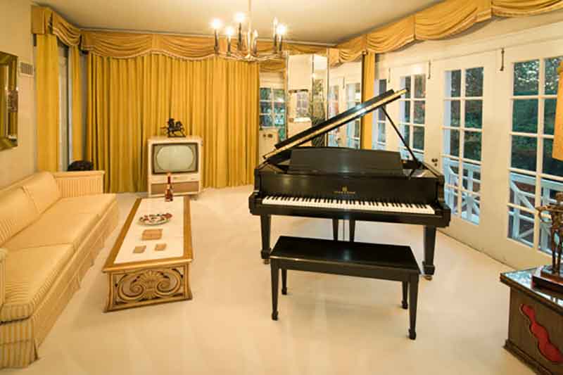 Elvis added to the square footage over the years (it now totals more than 17,500 square feet) with the construction of a trophy room, originally used by Elvis and his friends to race slot cars. and the racquetball building. It was there that he played piano and sang gospel songs and “Blue Eyes Cryin’ in the Rain” with his cousin, Billy Smith, on the night he died.